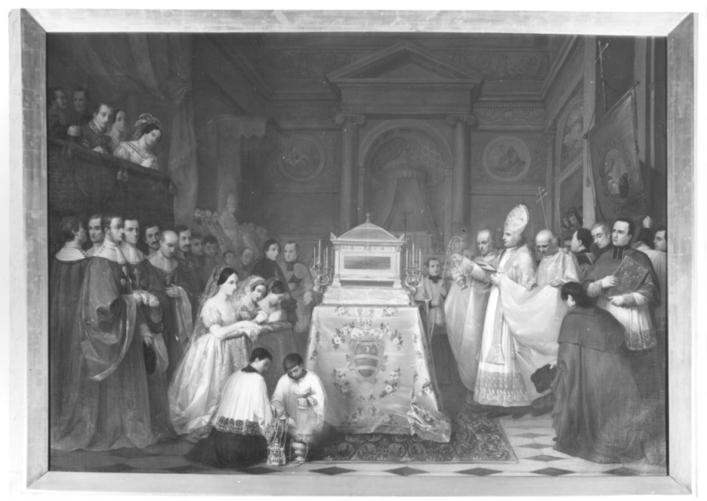 La traslazione delle reliquie di San Francesco di Sales nella chiesa della Visitazione d’Annecy, in Savoia, alla presenza del Re Carlo Felice e della Regina Maria Cristina di Borbone-Due Sicilie (entrambi nel palco reale) e di Mons. Claude-François de Thiollaz, Vescovo di Annecy (anni ’20 del XIX secolo).