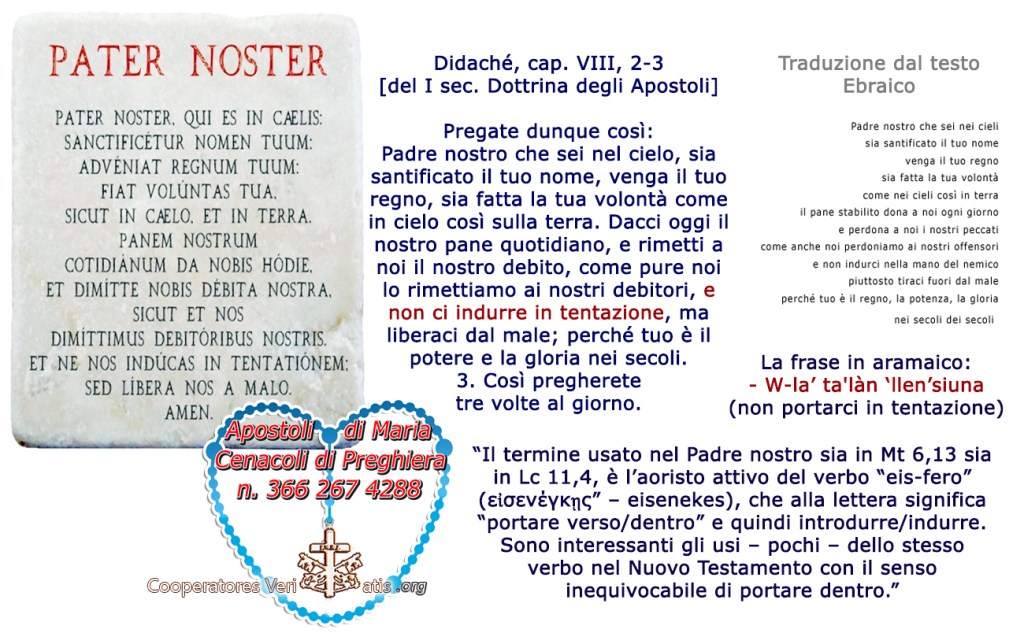Da qualche anno assistiamo ad un vero ammutinamento perchè, la nuova traduzione, è stata ora imposta e chi assiste alla Messa sentirà, al termine della Preghiera di Gesù, la vera Babele di una frase conclusiva non più comprensibile, dove ognuno dice e ripete a pappagallo una frase che non solo continua a non comprendere, ma diversa a seconda di come la ripete il fedele. Non lo diciamo per sentito dire, alla Messa il finale del Padre Nostro che ne scaturisce è il conseguente coro: «non abbandonarci alla tentazione (ma liberaci dal male)», la nuova versione CEI; con quanti continuano nella tradizione «non indurci in tentazione (ma liberaci dal male)», imponendo a questi ultimi l’obbligo di doversi adeguare alle mode dei tempi, “stanchi di udire la solita dottrina” (2Tim.4,1-5).