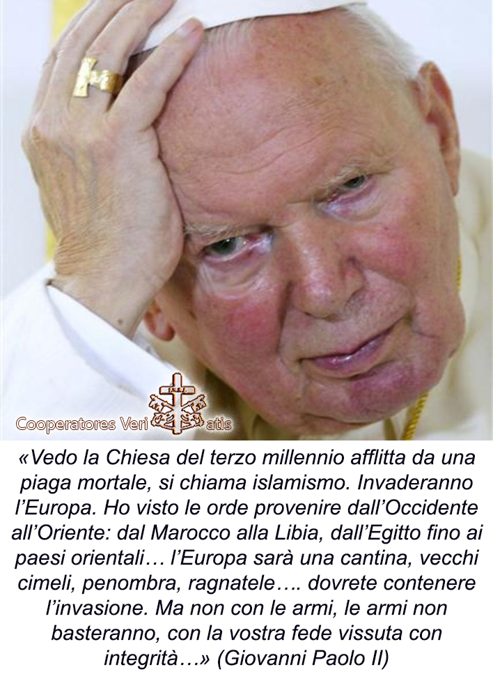 Nel punto in cui ci troviamo, e nel quale stiamo affossando l’Europa Cristiana, vedi qui, non è più importante approfondire la credibilità di certe “profezie” o aneddoti, quel che conta in questo momento è ciò che stiamo vivendo, e il destino suicida al quale ci siamo votati. Possiamo però prendere in considerazione “La visione di Giovanni Paolo II: «L’islam invaderà l’Europa»… vedi qui: «Vedo la Chiesa del terzo millennio afflitta da una piaga mortale, si chiama islamismo. Invaderanno l’Europa. Ho visto le orde provenire dall’Occidente all’Oriente: dal Marocco alla Libia, dall’Egitto fino ai paesi orientali… l’Europa sarà una cantina, vecchi cimeli, penombra, ragnatele…. dovrete contenere l’invasione. Ma non con le armi, le armi non basteranno, con la vostra fede vissuta con integrità…».