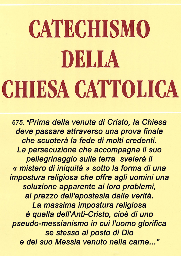 Così afferma il Catechismo della Chiesa Cattolica: 675. “Prima della venuta di Cristo, la Chiesa deve passare attraverso una prova finale che scuoterà la fede di molti credenti. La persecuzione che accompagna il suo pellegrinaggio sulla terra svelerà il « mistero di iniquità » sotto la forma di una impostura religiosa che offre agli uomini una soluzione apparente ai loro problemi, al prezzo dell’apostasia dalla verità. La massima impostura religiosa è quella dell’Anti-Cristo, cioè di uno pseudo-messianismo in cui l’uomo glorifica se stesso al posto di Dio e del suo Messia venuto nella carne…”