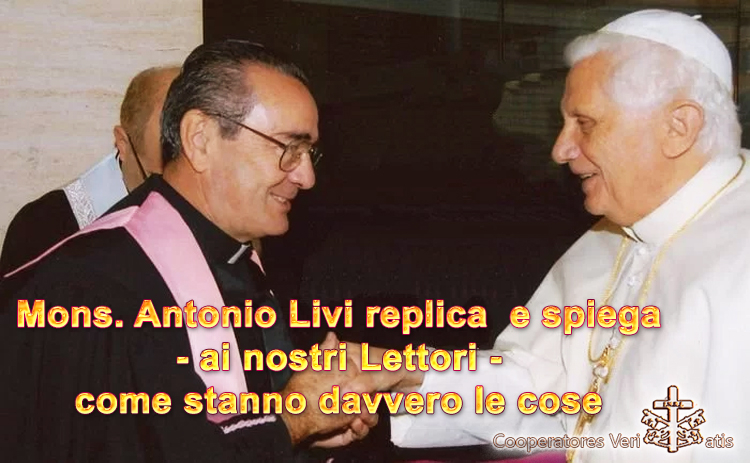 Cari Amici, essendoci arrivate molte richieste a riguardo del testo di mons. Antonio Livi intitolato “L’eresia al potere”, pubblicato da Sandro Magister nel suo sito, e a seguito delle polemiche avanzate da chi non solo non conosce i fatti, ma neppure si sforza di capire la situazione, abbiamo scritto direttamente a mons. Livi di aiutarci a darvi una risposta più diretta e verace. Ringraziando mons. Livi (al quale assicuriamo sempre la nostra Preghiera e affetto filiale) per l’umiltà dimostrata nell’aver risposto immediatamente alle nostre richieste, vi lasciamo leggere direttamente la sua risposta, che preghiamo tutti di riflettere attentamente e con tutta onestà intellettuale e di coscienza.