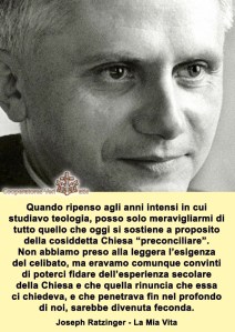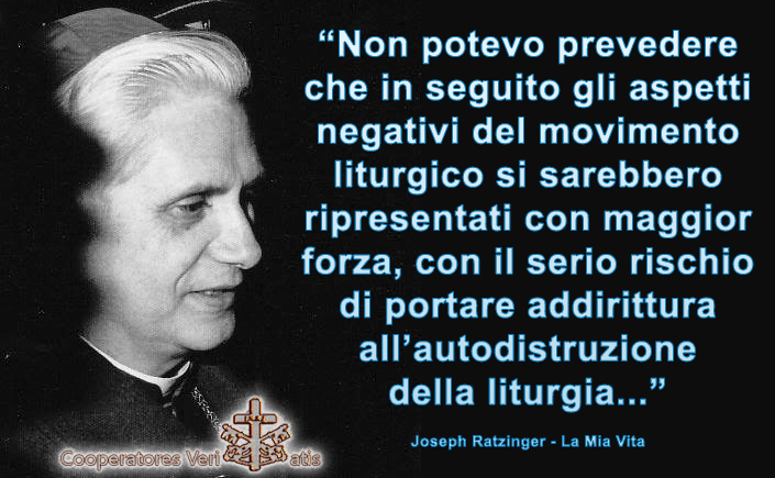 “Per questo, all’inizio del Concilio considerai lo schema preparatorio della costituzione sulla liturgia, che accoglieva tutte le conquiste essenziali del movimento liturgico, come un grandioso punto di partenza per quella adunanza ecclesiale, consigliando in tal senso il cardinal Frings. Non potevo prevedere che in seguito gli aspetti negativi del movimento liturgico si sarebbero ripresentati con maggior forza, con il serio rischio di portare addirittura all’autodistruzione della liturgia.” (Joseph Ratzinger)