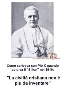 “La civiltà cristiana non è più da inventare, e neppure la nuova città da erigere nelle nuvole. Essa è stata, essa è: è la civiltà cristiana, è la città cattolica. Non si tratta che di instaurarla e restaurarla senza sosta sulle sue fondamenta naturali e divine contro gli attacchi sempre rinnovati della malsana utopia, della rivolta e dell’empietà “. (san Pio X quando colpiva il ” Sillon ” nel 1910)