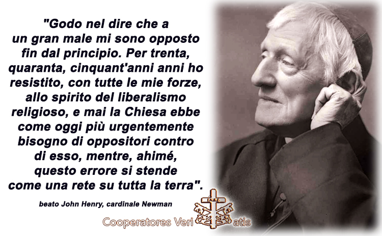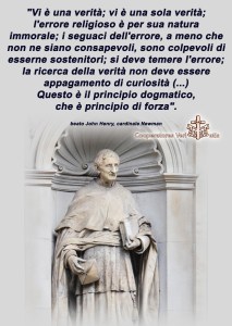 Newman fu dominato dalla persuasione che la Verità esiste ed è “una sola”, o la Chiesa Cattolica dice e possiede questa Verità, oppure non esiste e tutti siamo stati ingannati. Solo dalla ricerca di questa verità fluisce il vero dialogo, che solo la verità ci fa autentici e liberi e ci apre la strada verso la realizzazione di noi stessi. Senza la Verità il dialogo che si pretende avanzare è FALSO, è difettato, inizia da una menzogna e finisce nel baratro delle utopie ingannatrici.