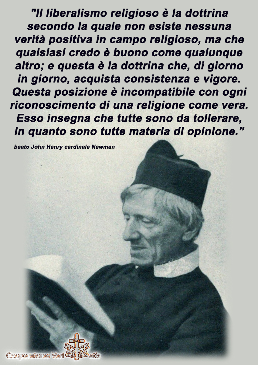 “Il liberalismo religioso è la dottrina secondo la quale non esiste nessuna verità positiva in campo religioso, ma che qualsiasi credo è buono come qualunque altro; e questa è la dottrina che, di giorno in giorno, acquista consistenza e vigore. Questa posizione è incompatibile con ogni riconoscimento di una religione come vera. Esso insegna che tutte sono da tollerare, in quanto sono tutte materia di opinione. La religione rivelata non è verità, ma sentimento e gusto, non fatto obiettivo (…) Ogni individuo ha diritto a interpretarla a modo suo (…) Si può andare nelle chiese protestanti e in quelle cattoliche; si può ristorare lo spirito in ambedue e non appartenere a nessuna. Si può fraternizzare insieme in pensieri e affari spirituali, senza avere dottrina comune o vederne la necessità. Poiché la religione è un fatto personale e un bene esclusivamente privato, la dobbiamo ignorare nei rapporti reciproci“.
