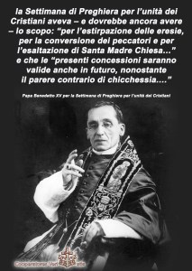 E’ chiaro, quindi, che la Settimana di Preghiera per l’unità dei Cristiani aveva – e dovrebbe ancora avere – lo scopo: “per l’estirpazione delle eresie, per la conversione dei peccatori e per l’esaltazione di Santa Madre Chiesa…” e che le “presenti concessioni saranno valide anche in futuro, nonostante il parere contrario di chicchessia.…”
