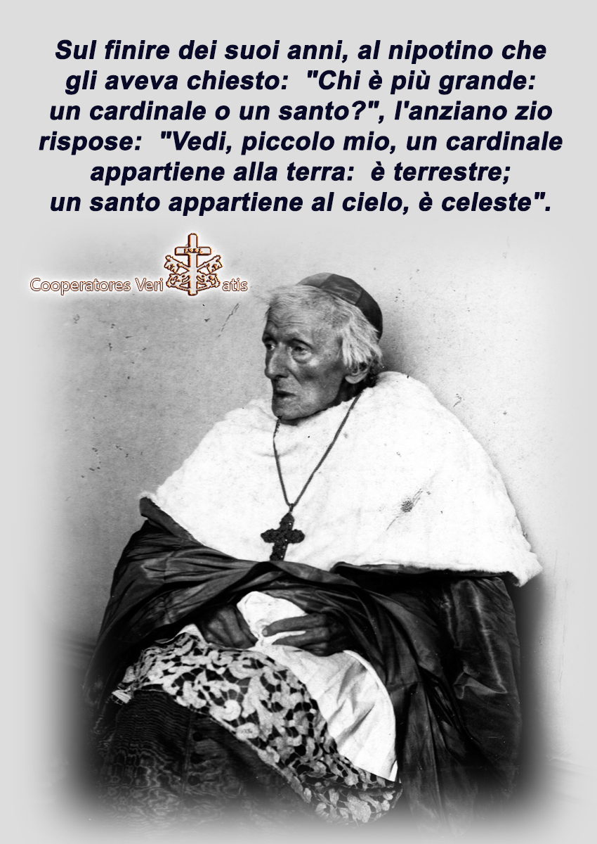 Sul finire dei suoi anni, al nipotino che – in visita con la nonna Jemima, la sorella di Newman – contravvenendo alla raccomandazione di non fare domande, gli aveva chiesto: “Chi è più grande: un cardinale o un santo?”, l’anziano zio rispose: “Vedi, piccolo mio, un cardinale appartiene alla terra: è terrestre; un santo appartiene al cielo, è celeste“.