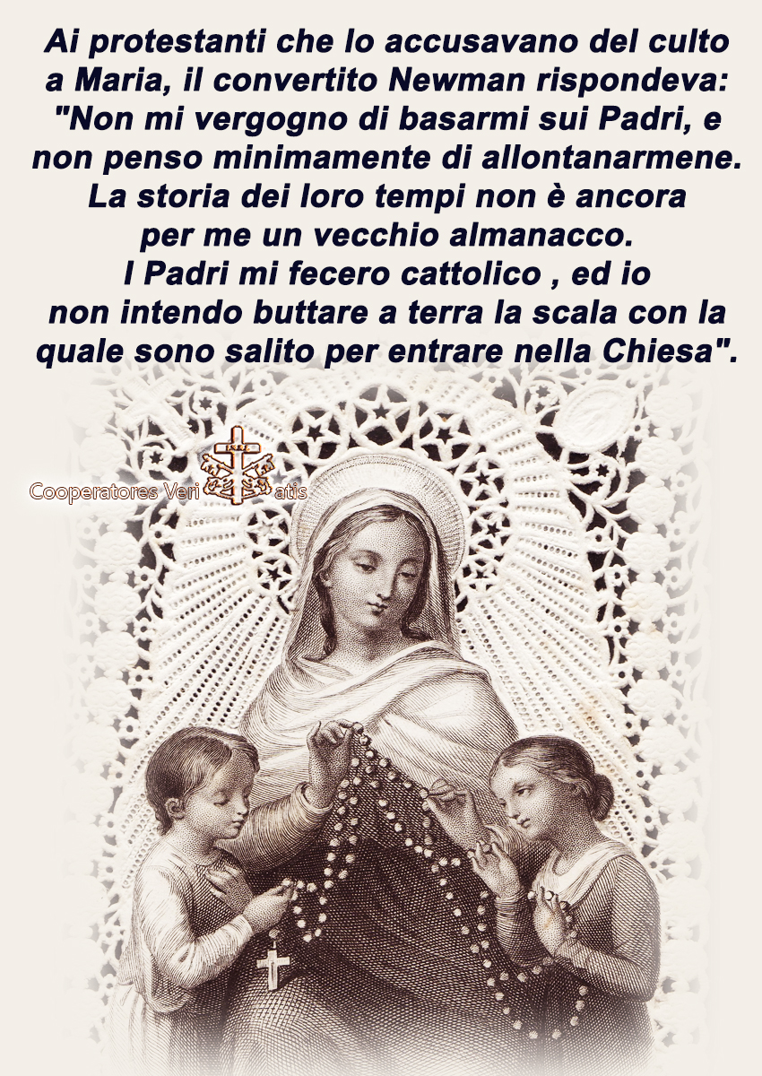 “I Padri mi fecero cattolico“: così il cardinale beato, ed ora anche Santo, Newman lo dichiarava a Edward B. Pusey. Questi aveva criticato il culto cattolico a Maria, ritenendolo uno sviluppo anomalo della pietà cristiana e un grave ostacolo per l’intesa degli anglicani coi cattolici, e Newman nella nota lettera a Pusey risponderà: “Non mi vergogno di basarmi sui Padri, e non penso minimamente di allontanarmene. La storia dei loro tempi non è ancora per me un vecchio almanacco. I Padri mi fecero cattolico (The Fathers made me a Catholic), ed io non intendo buttare a terra la scala con la quale sono salito per entrare nella Chiesa“.