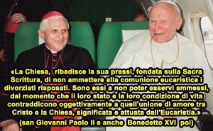 Così come l’abbiamo sia nel Catechismo al n. 1650, sia nella Sacramentum Caritatis al n.29 di Benedetto XVI, tre interventi magisteriali che basandosi sul Magistero della Chiesa di sempre, ribadiscono la vera dottrina, senza alcuna scorciatoia, fraintendimento o la creazione di “categorie privilegiate” di peccatori, ai quali dare l’Eucaristia mentre vivono in pieno e consapevole concubinato. E’ la “Sacra Scrittura” a non ammettere queste persone all’Eucaristia, non è una capriccio della Chiesa. E la responsabilità è loro, non della Chiesa.
