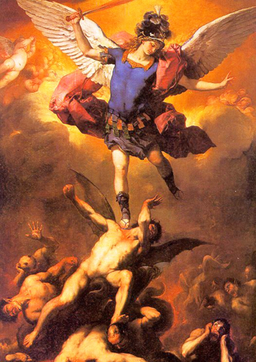 - San Michele Arcangelo, difendeteci nella battaglia; siate nostro aiuto contro la malvagità e le insidie del diavolo. Che Dio eserciti su di lui il suo dominio, Vi preghiamo supplichevoli: e Voi, o Principe della milizia celeste, col divino potere ricacciate nell’inferno Satana e gli altri spiriti maligni che si aggirano per il mondo per perdere le anime. Così sia.
