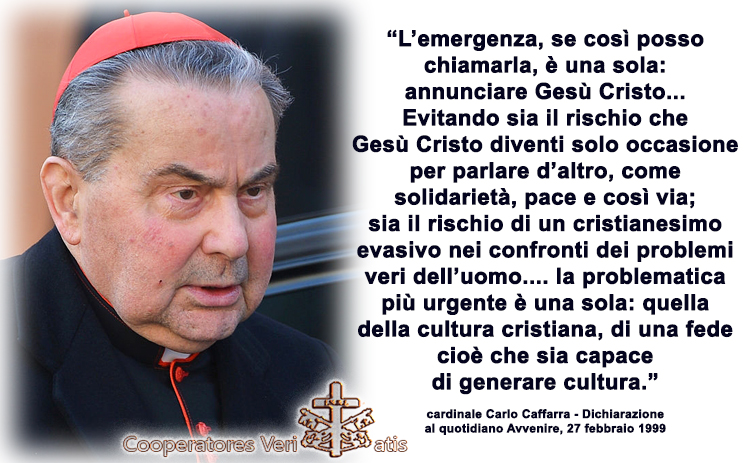 27 – L’emergenza, se così posso chiamarla, è una sola: annunciare Gesù Cristo puramente e semplicemente, con un annuncio fatto al «cuore» di ogni persona, così che tutto il suo vissuto quotidiano ne sia coinvolto e trasformato. Evitando sia il rischio che Gesù Cristo diventi solo occasione per parlare d’altro, come solidarietà, pace e così via; sia il rischio di un cristianesimo evasivo nei confronti dei problemi veri dell’uomo…. la problematica più urgente è una sola: quella della cultura cristiana, di una fede cioè che sia capace di generare cultura. In una parola ciò che si cerca di realizzare è che l’annuncio del Vangelo accada là dove l’umano di ogni persona è generato, perché lo sia in Cristo… e non in Adamo, affrontando ogni giorno la sfida più grave fatta oggi al Vangelo, il gaio nichilismo contemporaneo. (Dichiarazione al quotidiano Avvenire, 27 febbraio 1999)