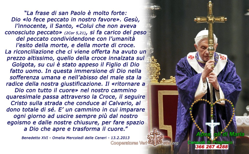 Con questo spirito, iniziamo il tempo favorevole della Quaresima, come ci ha ricordato san Paolo nella Seconda Lettura, per lasciarci riconciliare con Dio in Cristo Gesù. L’Apostolo si presenta come ambasciatore di Cristo e mostra chiaramente come proprio in forza di Lui, venga offerta al peccatore, e cioè a ciascuno di noi, la possibilità di un’autentica riconciliazione. «Colui che non aveva conosciuto peccato, – egli dice – Dio lo trattò da peccato in nostro favore, perché noi potessimo diventare per mezzo di lui giustizia di Dio» (2 Cor 5,21). Solo Cristo può trasformare ogni situazione di peccato in novità di grazia. Ecco perché assume un forte impatto spirituale l’esortazione che Paolo indirizza ai cristiani di Corinto: ”Vi supplichiamo in nome di Cristo: lasciatevi riconciliare con Dio”; e ancora: “Ecco ora il momento favorevole, ecco ora il giorno della salvezza!” (5,20; 6,2). Mentre Gioele parlava del futuro giorno del Signore come di un giorno di terribile giudizio, san Paolo, riferendosi alla parola del profeta Isaia, parla di “momento favorevole”, di “giorno della salvezza”. Il futuro giorno del Signore è divenuto l’“oggi”. Il giorno terribile si è trasformato nella Croce e nella Risurrezione di Cristo, nel giorno della salvezza. E questo giorno è ora, come abbiamo ascoltato nel Canto al Vangelo: “Oggi non indurite il vostro cuore, ma ascoltate la voce del Signore”. L’appello alla conversione, alla penitenza risuona quest’oggi con tutta la sua forza, perché la sua eco ci accompagni in ogni momento della vita.