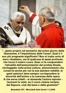 Altro rito simbolico, gesto proprio ed esclusivo del primo giorno della Quaresima, è l’imposizione delle Ceneri. Qual è il suo più pregnante significato? Non si tratta certo di mero ritualismo, ma di qualcosa di assai profondo, che tocca il nostro cuore. Esso ci fa comprendere l’attualità dell’ammonimento del profeta Gioele, riecheggiato nella prima Lettura, ammonimento che conserva anche per noi la sua salutare validità: ai gesti esteriori deve sempre corrispondere la sincerità dell’animo e la coerenza delle opere. A che serve infatti – si domanda l’autore ispirato – lacerarsi le vesti, se il cuore rimane lontano dal Signore, cioè dal bene e dalla giustizia? Ecco ciò che conta veramente: ritornare a Dio, con animo sinceramente pentito, per ottenere la sua misericordia (cfr Gl 2, 12-18). Un cuore nuovo e uno spirito nuovo: questo domandiamo con il Salmo penitenziale per eccellenza, il Miserere, che quest’oggi cantiamo col ritornello “Perdonaci, Signore, abbiamo peccato”. Il vero credente, consapevole di essere peccatore, aspira con tutto se stesso – spirito, anima e corpo – al perdono divino, come a una nuova creazione, in grado di restituirgli gioia e speranza (cfr Sal 50, 3.5.12.14).