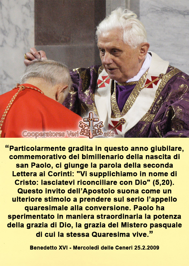 Particolarmente gradita in questo anno giubilare, commemorativo del bimillenario della nascita di san Paolo, ci giunge la parola della seconda Lettera ai Corinti: “Vi supplichiamo in nome di Cristo: lasciatevi riconciliare con Dio” (5,20). Questo invito dell’Apostolo suona come un ulteriore stimolo a prendere sul serio l’appello quaresimale alla conversione. Paolo ha sperimentato in maniera straordinaria la potenza della grazia di Dio, la grazia del Mistero pasquale di cui la stessa Quaresima vive. Egli si presenta a noi come “ambasciatore” del Signore. Chi allora meglio di lui può aiutarci a percorrere in maniera fruttuosa questo itinerario di interiore conversione? Nella prima Lettera a Timoteo scrive: “Cristo Gesù è venuto nel mondo per salvare i peccatori, il primo dei quali sono io”, ed aggiunge: “Ma appunto per questo ho ottenuto misericordia, perché Cristo Gesù ha voluto in me, per primo, dimostrare tutta quanta la sua magnanimità, e io fossi di esempio a quelli che avrebbero creduto in lui per avere la vita eterna” (1,15-16). L’Apostolo è dunque cosciente di essere stato scelto come esempio, e questa sua esemplarità riguarda proprio la conversione, la trasformazione della sua vita avvenuta grazie all’amore misericordioso di Dio. “Prima ero un bestemmiatore, un persecutore e un violento – egli riconosce – ma mi è stata usata misericordia … e così la grazia del Signore nostro ha sovrabbondato” (ibid. 1,13-14). L’intera sua predicazione, e prima ancora, tutta la sua esistenza missionaria furono sostenute da una spinta interiore riconducibile all’esperienza fondamentale della “grazia”. “Per grazia di Dio sono quello che sono – scrive ai Corinzi – … ho faticato più di tutti loro [gli apostoli], non io però, ma la grazia di Dio che è con me” (1 Cor 15,10). Si tratta di una consapevolezza che affiora in ogni suo scritto ed ha funzionato come una “leva” interiore su cui Dio ha potuto agire per spingerlo avanti, verso sempre ulteriori confini non solo geografici, ma anche spirituali.