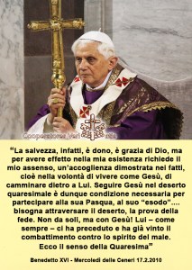 Tutto questo il Signore Gesù lo ha fatto per noi. Lo ha fatto per salvarci, e al tempo stesso per mostrarci la via per seguirlo. La salvezza, infatti, è dono, è grazia di Dio, ma per avere effetto nella mia esistenza richiede il mio assenso, un’accoglienza dimostrata nei fatti, cioè nella volontà di vivere come Gesù, di camminare dietro a Lui. Seguire Gesù nel deserto quaresimale è dunque condizione necessaria per partecipare alla sua Pasqua, al suo “esodo”. Adamo fu cacciato dal Paradiso terrestre, simbolo della comunione con Dio; ora, per ritornare a questa comunione e dunque alla vera vita, la vita eterna, bisogna attraversare il deserto, la prova della fede. Non da soli, ma con Gesù! Lui – come sempre – ci ha preceduto e ha già vinto il combattimento contro lo spirito del male. Ecco il senso della Quaresima, tempo liturgico che ogni anno ci invita a rinnovare la scelta di seguire Cristo sulla via dell’umiltà per partecipare alla sua vittoria sul peccato e sulla morte.