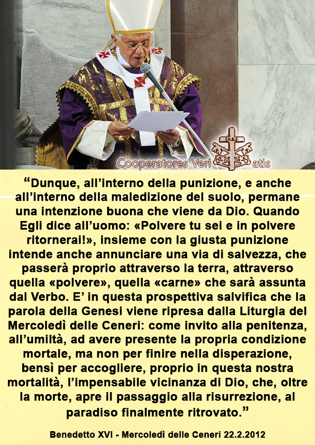 Dicevamo poco fa, citando san Giovanni Crisostomo, che la maledizione del suolo ha una funzione «medicinale». Ciò significa che l’intenzione di Dio, che è sempre benefica, è più profonda della maledizione. Questa, infatti, è dovuta non a Dio ma al peccato, però Dio non può non infliggerla, perché rispetta la libertà dell’uomo e le sue conseguenze, anche negative. Dunque, all’interno della punizione, e anche all’interno della maledizione del suolo, permane una intenzione buona che viene da Dio. Quando Egli dice all’uomo: «Polvere tu sei e in polvere ritornerai!», insieme con la giusta punizione intende anche annunciare una via di salvezza, che passerà proprio attraverso la terra, attraverso quella «polvere», quella «carne» che sarà assunta dal Verbo. E’ in questa prospettiva salvifica che la parola della Genesi viene ripresa dalla Liturgia del Mercoledì delle Ceneri: come invito alla penitenza, all’umiltà, ad avere presente la propria condizione mortale, ma non per finire nella disperazione, bensì per accogliere, proprio in questa nostra mortalità, l’impensabile vicinanza di Dio, che, oltre la morte, apre il passaggio alla risurrezione, al paradiso finalmente ritrovato. In questo senso ci orienta un testo di Origene, che dice: «Ciò che inizialmente era carne, dalla terra, un uomo di polvere (cfr 1 Cor15,47), e fu dissolto attraverso la morte e di nuovo reso polvere e cenere – infatti è scritto: sei polvere, e nella polvere ritornerai – viene fatto risorgere di nuovo dalla terra. In seguito, secondo i meriti dell’anima che abita il corpo, la persona avanza verso la gloria di un corpo spirituale» (Sui Princìpi 3, 6, 5: Sch, 268, 248).