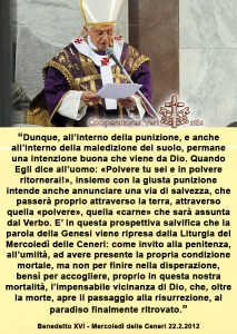 In questa prospettiva si comprende anche il segno penitenziale delle Ceneri, che vengono imposte sul capo di quanti iniziano con buona volontà l’itinerario quaresimale. E’ essenzialmente un gesto di umiltà, che significa: mi riconosco per quello che sono, una creatura fragile, fatta di terra e destinata alla terra, ma anche fatta ad immagine di Dio e destinata a Lui. Polvere, sì, ma amata, plasmata dal suo amore, animata dal suo soffio vitale, capace di riconoscere la sua voce e di rispondergli; libera e, per questo, capace anche di disobbedirgli, cedendo alla tentazione dell’orgoglio e dell’autosufficienza. Ecco il peccato, malattia mortale entrata ben presto ad inquinare la terra benedetta che è l’essere umano. Creato ad immagine del Santo e del Giusto, l’uomo ha perduto la propria innocenza ed ora può ritornare ad essere giusto solo grazie alla giustizia di Dio, la giustizia dell’amore che – come scrive san Paolo – “si è manifestata per mezzo della fede in Cristo” (Rm 3,22). Da queste parole dell’Apostolo ho tratto lo spunto per il mio Messaggio, rivolto a tutti i fedeli in occasione di questa Quaresima: una riflessione sul tema della giustizia alla luce delle Sacre Scritture e del loro compimento in Cristo.