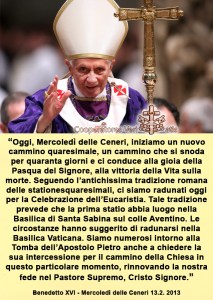 Oggi, Mercoledì delle Ceneri, iniziamo un nuovo cammino quaresimale, un cammino che si snoda per quaranta giorni e ci conduce alla gioia della Pasqua del Signore, alla vittoria della Vita sulla morte. Seguendo l’antichissima tradizione romana delle stationesquaresimali, ci siamo radunati oggi per la Celebrazione dell’Eucaristia. Tale tradizione prevede che la prima statio abbia luogo nella Basilica di Santa Sabina sul colle Aventino. Le circostanze hanno suggerito di radunarsi nella Basilica Vaticana. Siamo numerosi intorno alla Tomba dell’Apostolo Pietro anche a chiedere la sua intercessione per il cammino della Chiesa in questo particolare momento, rinnovando la nostra fede nel Pastore Supremo, Cristo Signore. Per me è un’occasione propizia per ringraziare tutti, specialmente i fedeli della Diocesi di Roma, mentre mi accingo a concludere il ministero petrino, e per chiedere un particolare ricordo nella preghiera.