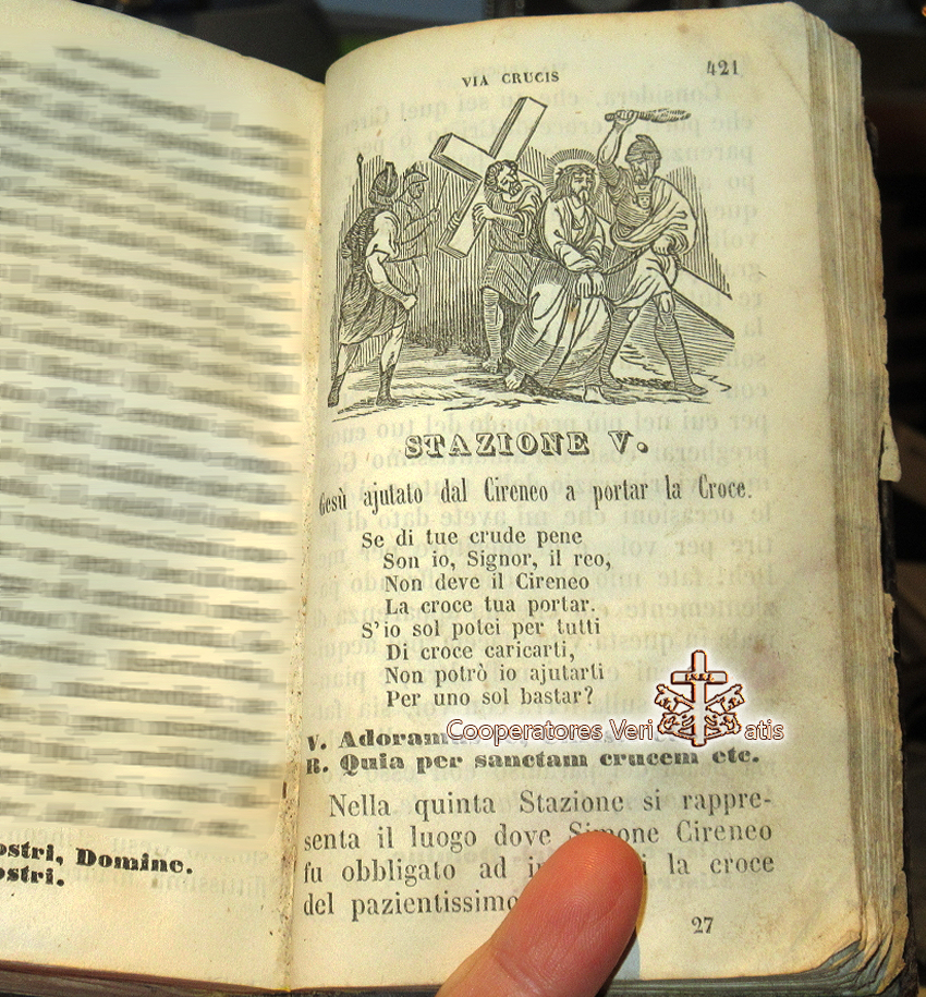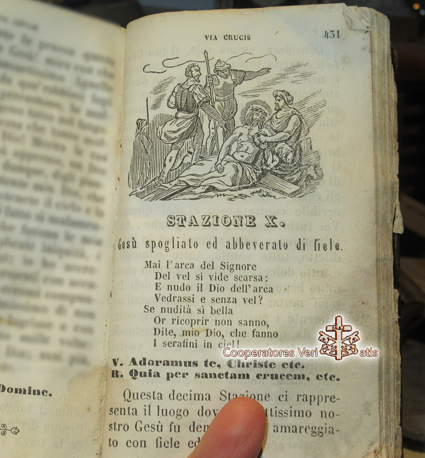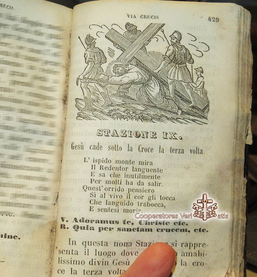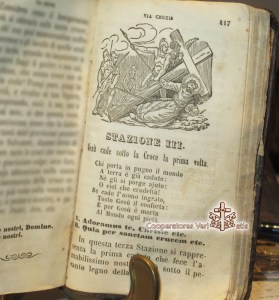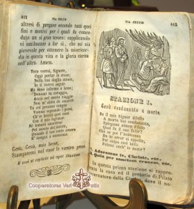 Avremo voluto scansionarlo ma la fragilità della carta ci ha reso impossibile l’opera e così abbiamo digitato – fedelmente – l’intera Via Crucis meditata da san Leonardo da Porto Maurizio offrendovi, a lato, le varie immagini in originale.