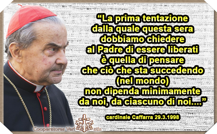 29 – Siamo sempre chiamati ad essere dentro alle vicende umane come credenti in Cristo. Specialmente quando esse sembrano essere così assurde da non poter più essere capite, abbiamo bisogno della sapienza che viene dall’alto: per orientarci nei nostri giudizi e nelle nostre scelte. La prima tentazione dalla quale questa sera dobbiamo chiedere al Padre di essere liberati è quella di pensare che ciò che sta succedendo (nel mondo) non dipenda minimamente da noi, da ciascuno di noi. Abbiamo a nostra disposizione una possibilità di influire sulle decisioni degli uomini dai quali dipende più direttamente il governo delle cose umane. E’ la possibilità di pregare. E’ certezza incrollabile della nostra fede che la storia non è il risultato imprevisto o inevitabile o casuale di forze impersonali. La sua trama è tessuta dall’incrocio di tre libertà: quella del Padre che in Cristo porta avanti il suo progetto di salvezza dell’uomo, quella dell’uomo chiamato a cooperare a questo progetto, e quella di Satana che cerca in tutti i modi di distogliere l’uomo da questa cooperazione. La preghiera è richiesta che il Padre faccia avvenire il suo Regno e la sua giustizia; che muova la nostra libertà verso la sua Pace; che ci liberi dal maligno. E’ una richiesta che non può essere elusa dal Signore: “E Dio non farà giustizia ai suoi eletti che gridano giorno e notte verso di lui, e li farà a lungo aspettare? Vi dico che farà loro giustizia prontamente” (Lc.18,7-8). Ma quando saranno ascoltati? Nel libro dell’Apocalisse si descrive la preghiera dei giusti uccisi violentemente (Ap 6,9b-11a). “Fino a quando?” “Fu detto di pazientare ancora un poco”: la nostra pazienza ci fa guadagnare le nostre anime, perché “pregare per gli uomini significa versare il proprio sangue”. (29 marzo 1998)