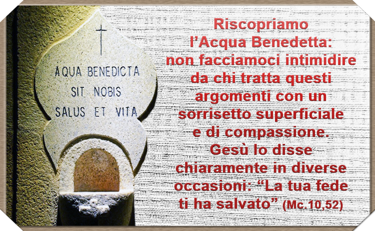 Per godere poi tutti i vantaggi a cui è ordinata l’Acqua Santa, bisogna usarla con sentimenti di fede (che non è sentimentalismo o romanticismo), di umiltà e di contrizione, giacchè quest’Acqua non opera se non per via di impetrazione, e sempre a misura delle disposizioni di chi se ne serve. E’ dunque interesse di ogni cristiano d’adoperarla frequentemente, ma sempre con grande rispetto, e di tenerne sempre provveduta la propria casa.