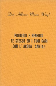 Vi facciamo perciò dono di questo piccolo libretto, Don Alfonso Maria Weigel, solo nove pagine, nelle quali si raccontano esperienze di vita che forse faremo bene a ricordare, scarica qui il pdf. Quando i genitori benedivano i propri figli con l’acqua santa, quando i contadini benedivano i propri campi di lavoro, quando le mamme stesse benedivano il talamo, la casa, i pasti, i figli, tutto, perché il Signore Gesù potesse Egli stesso essere coinvolto nella vita domestica delle persone. Benedivano i Defunti ogni giorno aspergendoli con l’acqua santa, e se ci studiassimo di scoprire quale REFRIGERIO giunge a quelle Anime ancora in Purgatorio, correremmo a chiedere al sacerdote di benedirci l’acqua da portare a casa, e lo faremo ogni giorno.
