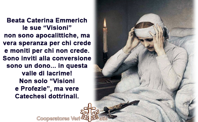 Fatta questa premessa, indispensabile per comprendere non solo l’esperienza dei mistici ma, nel nostro caso, anche per approfondire la figura della Beata Caterina Emmerik e le sue cosiddette “visioni”, va detto che nella Mistica si scongiura immediatamente il rischio di quella “presenza di Dio” data dalle suggestioni, da un dio immaginato, sognato o creato dalle proprie opinioni. La Mistica di cui parliamo getta via ogni dubbio quando, appunto, la Chiesa stessa, in quanto maestra, addita queste persone al culto ed alla venerazione e non tanto per le grazie che hanno sperimentato ma proprio per quello che da queste grazie è derivato e deriva, in ogni tempo, a nostro beneficio e a vantaggio di tutti. Le “visioni”, le apparizioni, le “confidenze di Dio” sono in sé secondarie: edificanti certamente, ma marginali e, in tal senso, “non vincolanti”. Tuttavia, non sono trascurabili, né possono essere attaccate impunemente: il Signore stesso permette questi momenti mistici per la nostra edificazione, per correggerci, per metterci in guardia dalle strade sbagliate che abbiamo intrapreso…