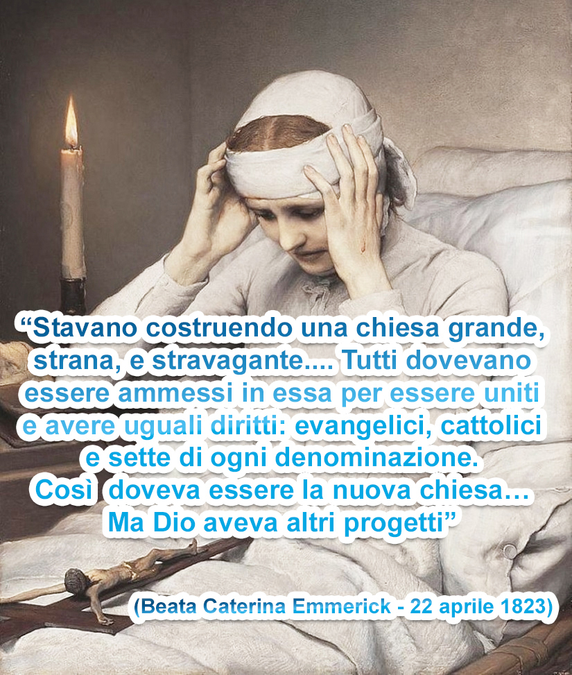 Come abbiamo spiegato, queste visioni non seguono un filo cronologico: spesso la beata ripercorre anche visioni passate e le riallaccia a quelle nuove; fa lei stessa i collegamenti; altre volte non dà alcuna spiegazione; altre ancora sorvola o perché insignificanti o perché troppo aberranti. Andando a rileggere santa Caterina da Siena, anche lei ci spiega che in ogni tempo, in ogni generazione, la Chiesa vive una personale apocalisse, frodi e persecuzioni, per poi uscirne vittoriosa e riformata, così è nelle visioni della Emmerich, un susseguirsi di tempi, 7 periodi, nei quali vediamo chiaramente il nostro tempo nel quale la Chiesa è perseguitata e spesso soffocata da queste “nuove chiese” che tentano di superarla. Come abbiamo letto, tuttavia, non ci riusciranno poiché la promessa del Signore è valida nonostante le nostre imperfezioni: le porte degli inferi non prevarranno.