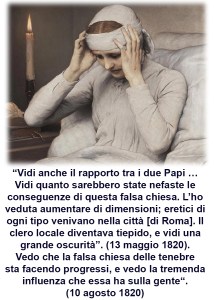 L’iter di beatificazione della suora si arrestò nel tempo in cui anche le profezie di La Salette subirono un attacco inaudito perché entrambe (questo lo diciamo noi, ma i fatti non ci smentiscono) parlavano di un futuro drammatico nella Chiesa, di grave apostasia dove ad essere coinvolti non erano semplicemente gli eretici, i fedeli, ma erano coinvolti Pastori, Vescovi, il Clero e persino i Papi. L’immagine di una Roma come “ventre dell’apostasia” non poteva essere facilmente digerita. Di conseguenza a sbagliare non era “Roma” ma queste profezie!