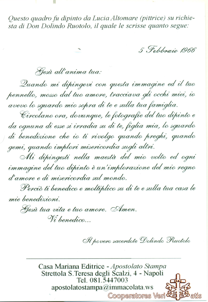 Mi dipingesti nella maestà del mio volto ed ogni immagine del tuo dipinto è un’implorazione del mio regno d’amore e di misericordia sul mondo. Perciò ti benedico e moltiplico su di te e sulla tua casa le mie benedizioni. Gesù tua vita e tuo amore. Amen.