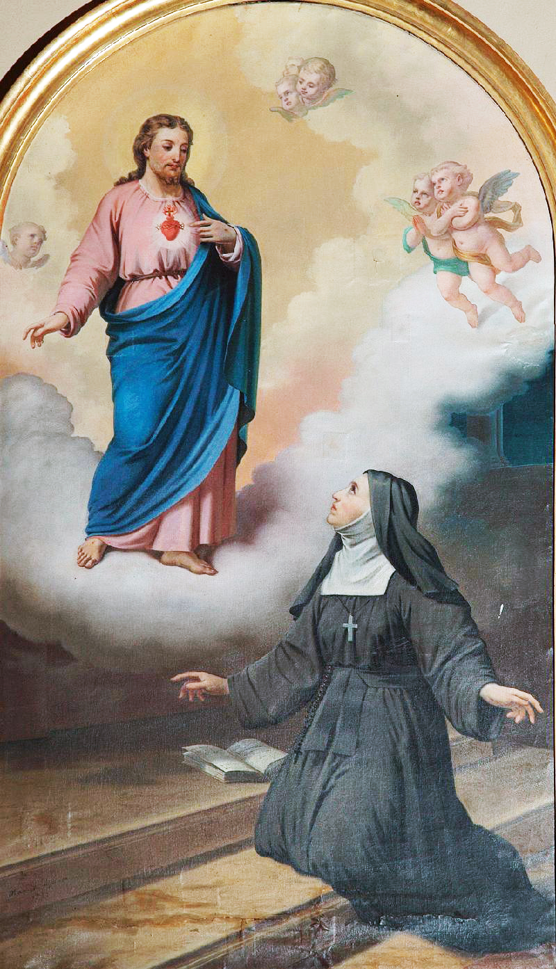 S. Margherita Maria Alacoque, suora francese, entrò il 20 giugno 1671 nel convento delle Visitandine di Paray-le-Monial (Saone-et-Loire), visse con grande semplicità e misticismo la sua esperienza di religiosa e morì il 17 ottobre 1690 ad appena 43 anni. Già prima di entrare nel convento, era dotata di doni mistici che si accentuarono con la sua nuova condizione di religiosa; ebbe numerose manifestazioni mistiche, ma nel 1673 cominciarono le grandi visioni che resero famoso il suo nome; esse furono quattro rivelazioni principali, oltre numerose altre di minore importanza.