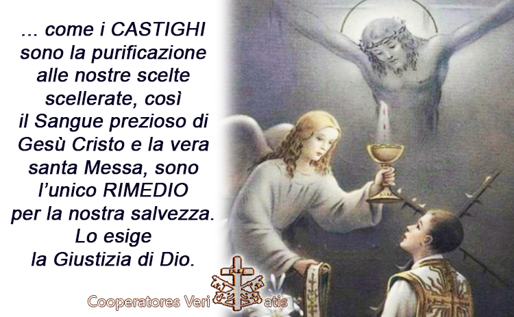 Ecco perchè l’aver ridotto la Messa, oggi, ad una cena conviviale, ad un raduno di fedeli esibizionisti e a celebranti pagliacci e ballerini, ha finito per stravolgere anche il senso del peccato, dell’espiazione, del sacrificio, del vero “castigo”, ossia di questa PURIFICAZIONE a noi necessaria. La vera Misericordia di Dio, infatti, parte proprio da quel provvidenziale “trarre un bene dal male”, ma non certo di trasformare un bene in male, o viceversa come dice Isaia al cap. 5 un male farlo diventare un bene! La teologia luterana di cui oggi la pastorale della chiesa è infetta, è proprio questo ribaltamento.