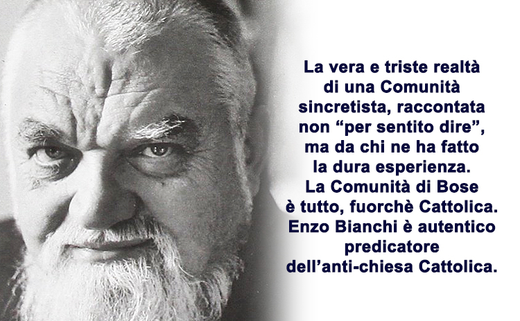 Chiariamo subito che, nel momento in cui questa “Casa di tolleranza religiosa” che è in Bose dicesse con chiarezza “ma guardate che noi non siamo affatto cattolici“, questo articolo cadrebbe immediatamente e tutto ciò che vi è scritto perderebbe il suo senso, ma nel momento in cui la Comunità di Bose nel suo fondatore continua a dirsi “cattolica”, beh allora l’articolo ha senso ed ha la sua ragione nel farsi sentire. Inoltre sottolineiamo che, questo breve studio, è stato realizzato con l’aiuto di chi, nella Comunità di Bose, ha fatto esperienza di persona, parliamo perciò non “per sentito dire“, ma quale testimonianza diretta. Inoltre, questo testo venne pubblicato nel 2012 sull’allora sito di “papalepapale“, ed oggi lo riproponiamo identico nel contenuto, con qualche lieve correzione.