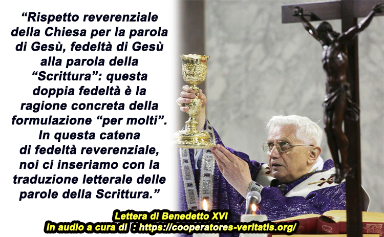 Nell’aprile 2012, Benedetto XVI, aveva inviato una Lettera all’Episcopato tedesco con la quale aveva ordinato che l’espressione “per tutti” attualmente presente nel Messale tra le parole della Consacrazione Eucaristica, venisse mutata in “per molti”, perché, disse il Pontefice, questa è la traduzione esatta del testo greco originale del Vangelo. Ma nessuno lo ascoltò, pochi gli obbedirono, ed oggi la confusione regna sovrana. Noi vi proponiamo il testo anche in audio, con una “premessa” tratta da un brillante articolo del teologo domenicano padre Giovanni Cavalcoli.