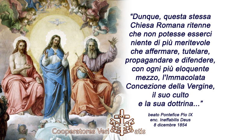 Perciò, dopo aver presentato senza interruzione, nell’umiltà e nel digiuno, le Nostre personali preghiere e quelle pubbliche della Chiesa, a Dio Padre per mezzo del suo Figlio, perché si degnasse di dirigere e di confermare la Nostra mente con la virtù dello Spirito Santo; dopo aver implorato l’assistenza dell’intera Corte celeste e dopo aver invocato con gemiti lo Spirito Paraclito; per sua divina ispirazione, ad onore della santa, ed indivisibile Trinità, a decoro e ornamento della Vergine Madre di Dio, ad esaltazione della Fede cattolica e ad incremento della Religione cristiana, con l’autorità di Nostro Signore Gesù Cristo, dei Santi Apostoli Pietro e Paolo e Nostra, dichiariamo, affermiamo e definiamo rivelata da Dio la dottrina che sostiene che la beatissima Vergine Maria fu preservata, per particolare grazia e privilegio di Dio onnipotente, in previsione dei meriti di Gesù Cristo Salvatore del genere umano, immune da ogni macchia di peccato originale fin dal primo istante del suo concepimento, e ciò deve pertanto essere oggetto di fede certo ed immutabile per tutti i fedeli.
