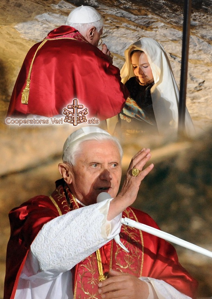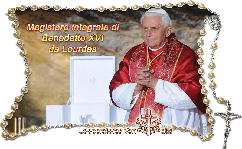 Venendo in pellegrinaggio qui, a Lourdes, noi vogliamo entrare, sulle orme di Bernadette, in quella straordinaria prossimità tra il cielo e la terra che non si è mai smentita e che non cessa di consolidarsi. Durante le apparizioni è da rilevare che Bernadette recita la corona sotto gli occhi di Maria, che si unisce a lei al momento della dossologia. Questo fatto conferma il carattere profondamente teocentrico della preghiera del Rosario. Quando recitiamo la corona, Maria ci offre il suo cuore e il suo sguardo per contemplare la vita del Figlio suo, Cristo Gesù. Il mio venerato Predecessore Giovanni Paolo II venne due volte qui, a Lourdes. Noi sappiamo quanto, nella sua vita e nel suo ministero, la preghiera si appoggiasse sull’intercessione della Vergine Maria. Come molti suoi Predecessori sulla Sede di Pietro, anch’egli incoraggiò vivamente la preghiera della corona; lo fece, tra l’altro, in un modo del tutto singolare, arricchendo il Rosario con la meditazione dei Misteri della Luce. Questi sono del resto rappresentati sulla facciata della Basilica nei nuovi mosaici, inaugurati l’anno scorso. Come per tutti gli avvenimenti della vita di Cristo che essa “serbava meditandoli nel suo cuore” (Lc 2,19), Maria ci fa comprendere tutte le tappe del ministero pubblico come parte integrante della rivelazione della Gloria di Dio. Possa Lourdes, terra di luce, restare una scuola per imparare a recitare il Rosario, che introduce i discepoli di Gesù, sotto gli occhi della Madre sua, in un dialogo autentico e cordiale con il suo Maestro!