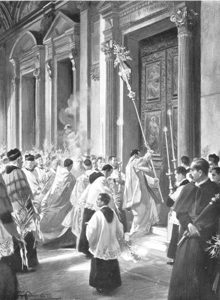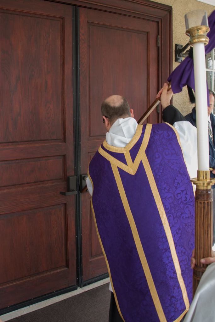 Nell’antica forma dei riti della Settimana Santa (cioè prima delle riforme della Settimana santa della metà degli anni ’50) c’è una bellissima cerimonia che si svolge la domenica delle palme dove la processione va fuori dalla chiesa e le porte della chiesa sono chiuse. La porta della chiesa viene poi bussata tre volte con l’asta della croce processionale. È un rito potente e commovente di cui Benedetto XVI spiegava: