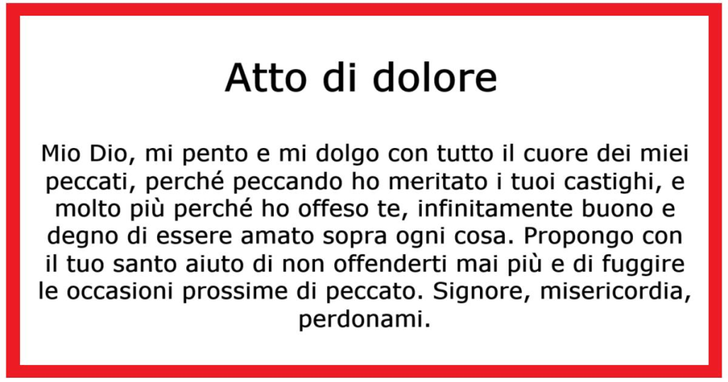 - Mio Dio, con tutto il cuore mi pento e mi pento di tutto ciò che ho fatto di male e del bene che ho omesso, perché peccando ho offeso Te, il più buono e degno di essere amato sopra ogni cosa.