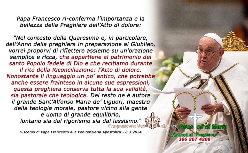 Nel contesto della Quaresima e, in particolare, dell’Anno della preghiera in preparazione al Giubileo, vorrei proporvi di riflettere assieme su un’orazione semplice e ricca, che appartiene al patrimonio del santo Popolo fedele di Dio e che recitiamo durante il rito della Riconciliazione: l’Atto di dolore.