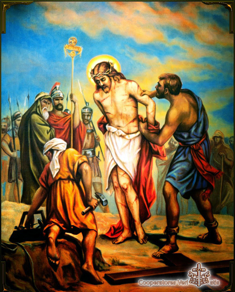 Vi siete a fin giunto, mio caro Gesù al Calvario, e Vi siete giunto trascinandovi. Qual vile, malfattore, percosso da calci, tirato da funi, accompagnato per più ignominia da due ladroni, che orrendo spettacolo. Martellate e chiodi alle mani, colpi e chiodi ai piedi, spine acutissime al capo, trafitto un Dio su durissima croce. Ahi che strazzi, che dolori, che spasimi. Ma quanta confusione, quanto sangue. Chi può contemplarVi o mio Gesù e non sentirsi spezzare il cuore per compassione. Deh permettetemi agonizzante mio Bene che a Voi mi accosti, poiché i miei peccati Vi hanno tratto a questa morte orrenda. Voglio baciare questa croce ricoverarmi in quelle piaghe, abbeverarmi in quel preziosissimo Sangue. Piaghe e sangue, sangue e piaghe del mio Gesù che mi avete redento, salvatemi, ve ne prego, salvatemi.