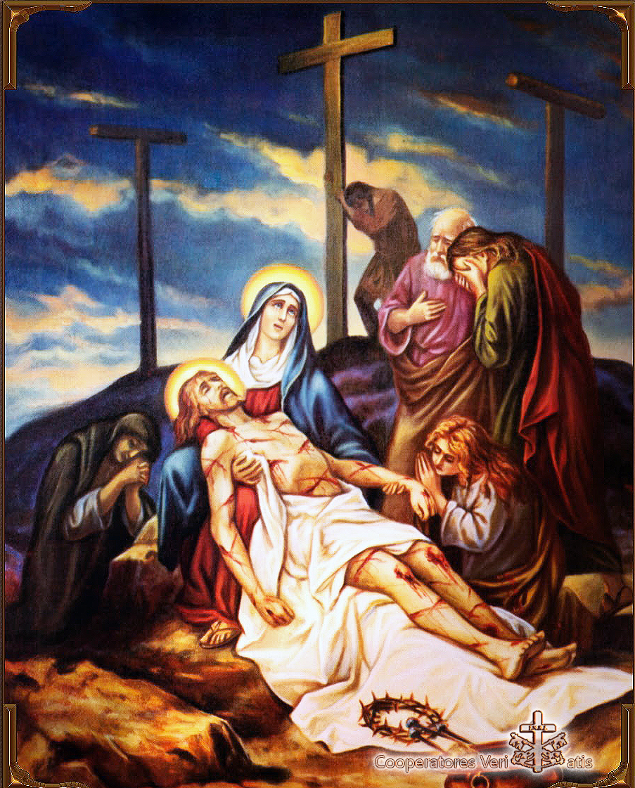 Ecco già consumato la Vittima, già compiuto il grande Sacrificio, la volontà già seguita dall’Eterno Padre. Ecco il Figliolo di Dio sull’altura del Golgota, confitto in croce, fatto spettacolo compassionevole al cielo, alla terra, agli elementi. Consummatum est. E’ morto. Il mio Gesù è morto. Quei lividi occhi santissimi, quelle labbra spiranti, quelle spine, quei chiodi, quelle piaghe, quel aperto costato, quel sangue, sono tutte fonti di misericordia che Egli vive. Ma intanto intorno a quella croce che io veggo con la spada in mano ancor la giustizia o mio infelice se ostinandomi nel mio peccato facessi vana l’opera della mia redenzione, quanta stoltezza. No, no mio Gesù non mi lasciate partire dal Calvario senza imprimermi nel cuore l’amarissima Vostra passione. Fate che temendo la Vostra giustizia viva e muoia nelle Vostre piaghe, nella Vostra sconfinata misericordia, sotto lo sguardo addolorato di Maria.