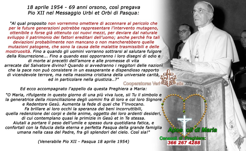 Si rinvigorisca dunque in voi tutti, diletti figli e figlie, col gaudio della Pasqua, la salda persuasione che la religione è condizione imprescindibile di vera vita, e che solo dalla sintesi operante dell’una e dell’altra scaturisce la soluzione dei piccoli e grandi problemi che angustiano la presente umanità.