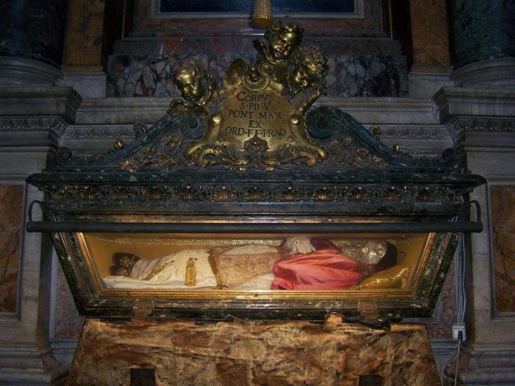 Lo fece ella di tutto cuore, e con grandissima tenerezza di spirito, ed essendosi fatta portare un berrettino del Santo Pontefice, donatole da Madama Martinozzi sua madre, e conservato da lei, come una preziosissima Reliquia, lo baciò con eccesso di divozione, e comandò, che le fosse messo in testa: e in un istante con immenso stupore de circostanti le cessò affatto il dolore, e il tremore, e la lasciarono i sintomi gravissimi che pativa, anzi partorì immediatamente con tanta felicità, come se non ne avesse avuto male alcuno; e quel che è ancora più ammirabile, non patì mai più simile infermità in due altre sue gravidanze, nelle quali di alla luce due Principi. Ella stessa partecipò al Sommo Pontefice Clemente IX. quanto erale occorso: ed i medici, che assisterono alla sua cura, dichiararono, ed attestarono con giuramento, che una sanazione di tal sorta non poteva farsi né tanto presto, né sì perfettamente, senza un gran miracolo. - Alcune donne impudiche, tanto abborrite da S. Pio, sentita che ebbero la nuova della morte di lui, se ne rallegrarono, e si portarono nella Basilica Vaticana a vedere il suo Cadavere, con pensiero di dileggiarlo. Ma avvenne tutto altro di quel, che aveano meditato: conciossiaché alla vista di lui rimasero sifattamente compunte, che si misero a pianger dirottamente i loro peccati, e convertitesi a Dio, menarono in avvenire una vita onesta e divota.