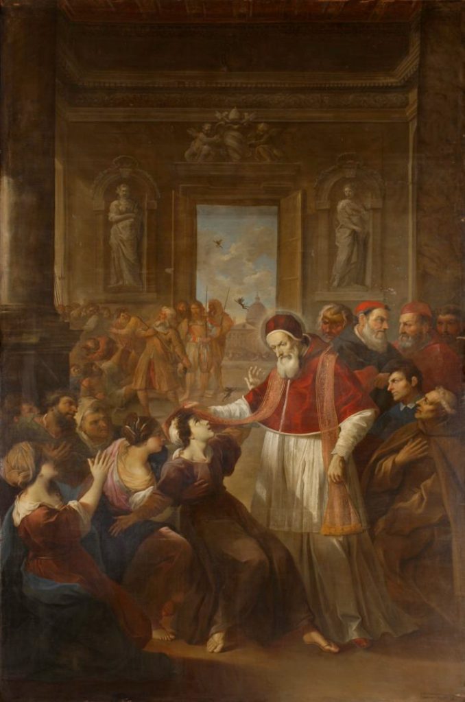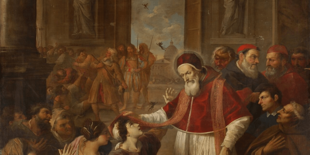 - Essendo in procinto di partire da Roma l’Ambasciatore del Re di Polonia, supplicò il Santo nel tempo che passava per la piazza di San Pietro, a volergli conceder qualche reliquia. Egli in quel punto, preso il proprio fazzoletto, raccolse colle sue mani qualche quantità di polvere della medesima piazza, e dopo avervela messa dentro, lo consegnò a quel signore, il quale ritornato a casa, temendo di essere stato burlato dal Papa, lo aprì, e con suo immenso stupore trovò tutta quella polvere intrisa di sangue, da cui era stato macchiato anche lo stesso fazzoletto: ed era sangue dei Martiri, dal quale era stato bagnato quel luogo nei tempi delle persecuzioni.