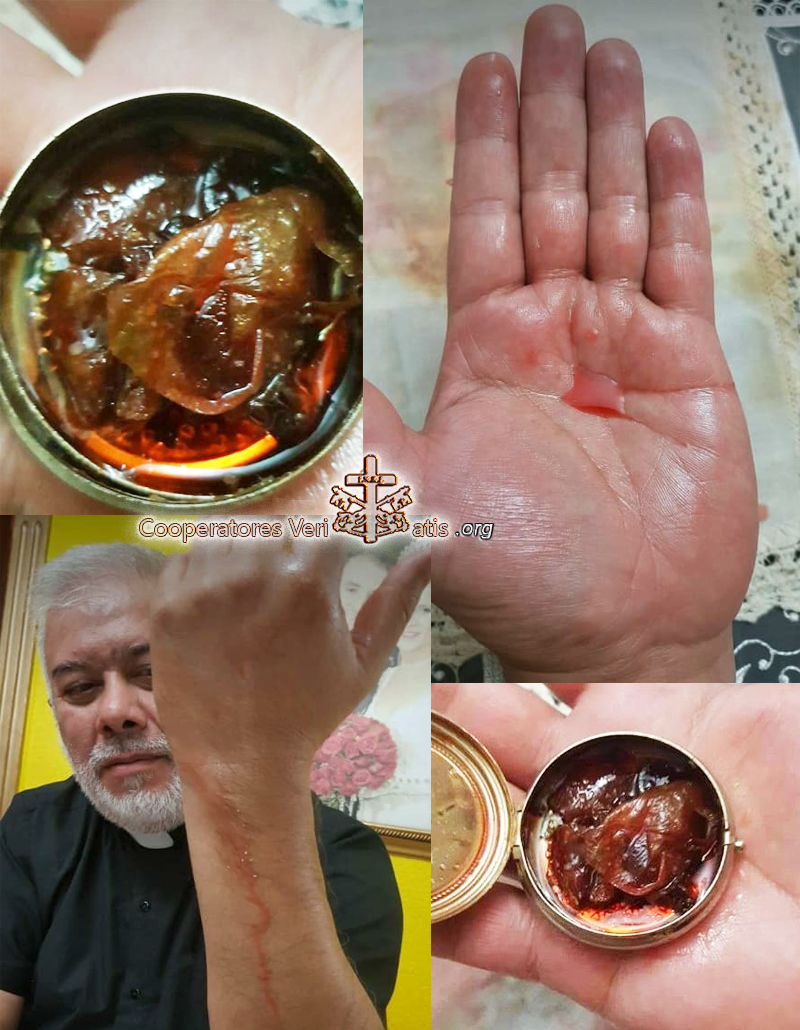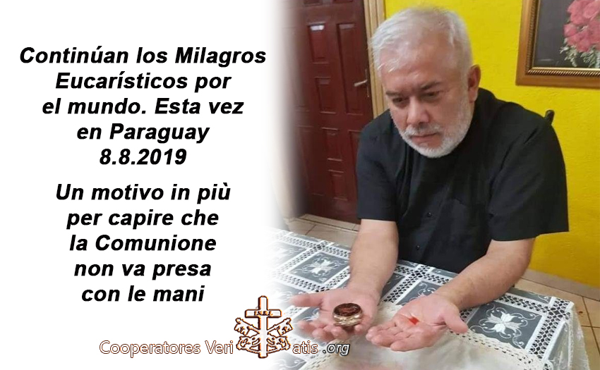 🙏È un miracolo accaduto l’8 di agosto (Festa di san Domenico) in Paraguay. Un sacerdote ha messo l’Ostia consacrata nella custodia da portare ad un malato e quando l’ha aperta….se convierte en carne y sangre dentro del relicario…. ossia si è fatto vedere per ciò che era: carne e sangue e profumava di rosa🙏 il fatto è approdato in Diocesi per l’esame del Vescovo…. Padre Gustavo proviene dalla parrocchia Virgen de la Merced – Valle del Puku-Aregua. (Tale manifestazione si spera sia confermata dalla Santa Chiesa)”
