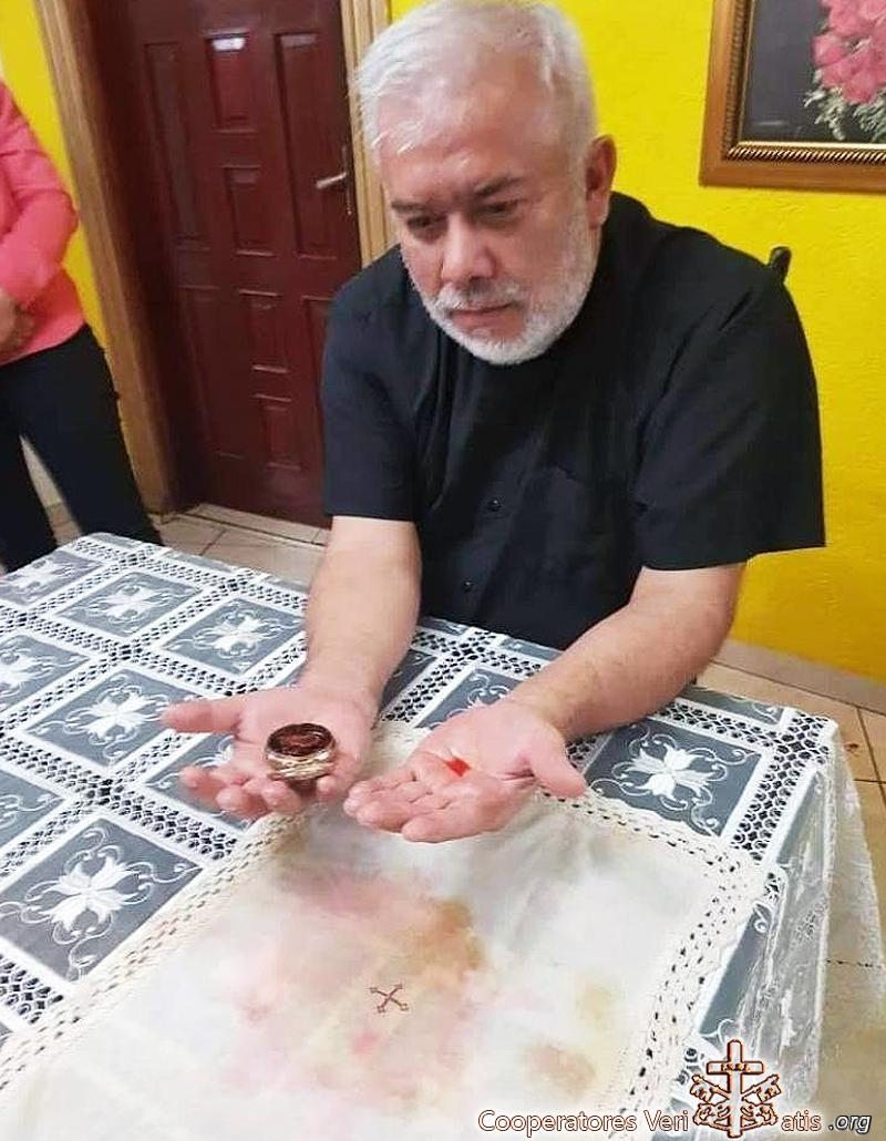 AGGIORNAMENTO PER QUANTI CONTESTANO I FATTI: Le immagini riportano, come sembra, petali di rosa mentre il sacerdote spiega che secondo lui non è sangue ma una sostanza oleosa e giustamente è prudente MA NON NEGA I FATTI quanto al resto, mettendo sempre la prudenza avanti a tutto, restano valide le parole del Cristo: nulla vale per colui che non vuole credere, e non è forse vero che “nulla è impossibile a Dio“? e ciò che contestiamo è quanti non vogliono credervi perché si tratta e di messa moderna o perché l’Ostia da portare agli ammalati la gestiscono i laici, come da noi e da molti anni e la prendono da soli…. laici che portano la comunione agli ammalati senza il prete….