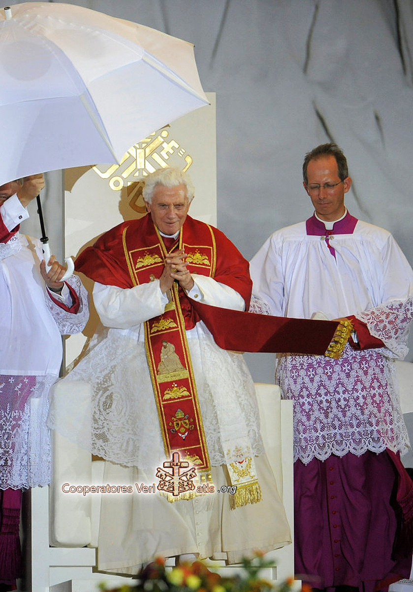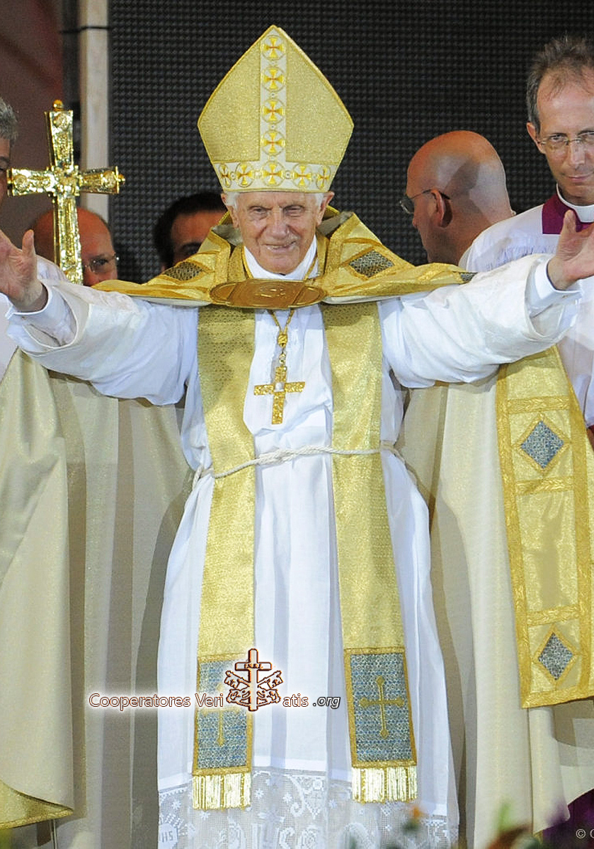 In portoghese spiega che “non si può credere senza essere aiutati dalla fede degli altri”. - Poi nel discorso della festa di inizio sottolinea che “vi sono parole che servono solamente per intrattenere e passano come il vento”, invece le parole di Dio servono per raggiungere “la vita autentica, quella che sempre vale la pena di vivere”. Invita i giovani ad essere “poveri di spirito, affamati di giustizia, misericordiosi, puri di cuore, amanti della pace” che solo Gesù può dare, puntando l’attenzione sulla vera conversione. Benedetto XVI chiede ai ragazzi che partecipano al raduno mondiale di fuggire da una “esistenza senza orizzonti, da una libertà senza Dio”, e cita come esempio negativo i “molti” che, “credendosi degli dei, pensano di non avere bisogno di radici né fondamenti che non siano essi stessi”. L’esortazione è di approfittare dei giorni della Gmg per “conoscere meglio Gesù” per considerare la vita “generosamente e senza mediocrità”, prendendo “seriamente la meta della santità”. Incontrando le Religiose, con somma dolcezza tipica della mitezza di Ratzinger, ammonisce che: “Vivere nella sequela di Cristo casto, povero ed obbediente è in tal modo una «esegesi» vivente della Parola di Dio…”, sottolineando come la Chiesa e il mondo stesso ha bisogno di questa fedeltà, di questa radicalità, di questa testimonianza, non di altro.