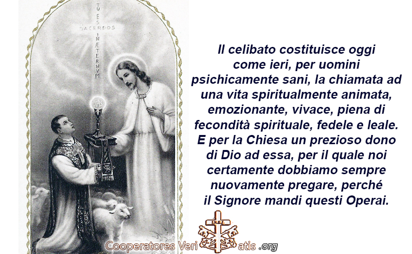 Il celibato sacerdotale vissuto con maturità, letizia e dedizione è una grandissima benedizione per la Chiesa e per la stessa società” (n. 24). Come è facile notare, l’esortazione apostolica Sacramentum caritatis moltiplica gli inviti affinché il sacerdote viva nell’offerta di se stesso, fino al sacrificio della croce, per una dedizione totale ed esclusiva a Cristo.