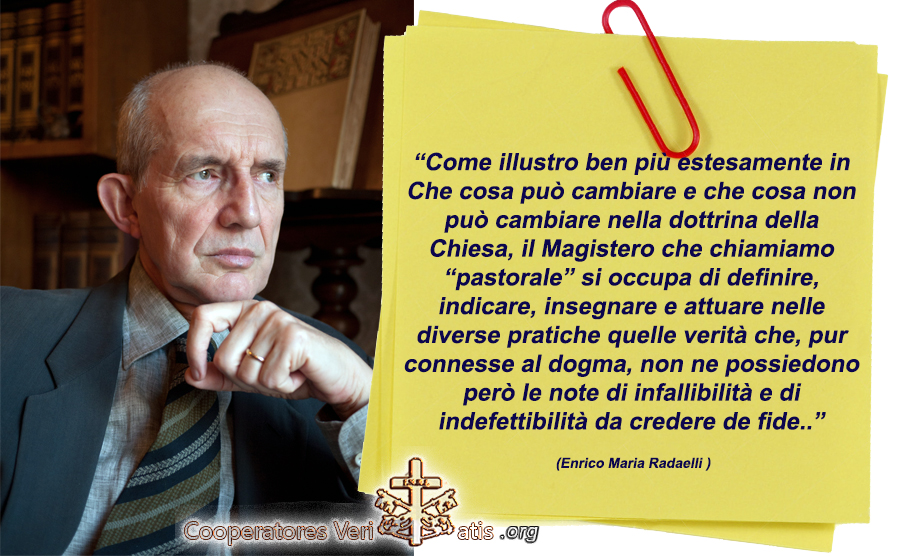 Come illustro ben più estesamente in Che cosa può cambiare e che cosa non può cambiare nella dottrina della Chiesa, in AA.VV., Dogma e Pastorale. L’ermeneutica del Magistero dal Vaticano II al Sinodo sulla famiglia, Leonardo da Vinci, Roma 2015, il Magistero che chiamiamo “pastorale” si occupa di definire, indicare, insegnare e attuare nelle diverse pratiche quelle verità che, pur connesse al dogma, non ne possiedono però le note di infallibilità e di indefettibilità da credere de fide.