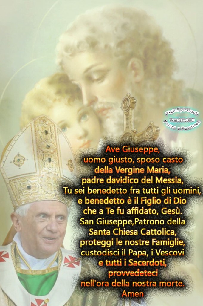 Cari amici, a san Giuseppe, patrono universale della Chiesa, desidero affidare tutti i Pastori, esortandoli ad offrire “ai fedeli cristiani e al mondo intero l’umile e quotidiana proposta delle parole e dei gesti di Cristo” (Lettera Indizione Anno Sacerdotale). Possa la nostra vita aderire sempre più alla Persona di Gesù, proprio perché “Colui che è il Verbo assume Egli stesso un corpo, viene da Dio come uomo e attira a sé l’intera esistenza umana, la porta dentro la parola di Dio” (Gesù di Nazaret, Milano 2007, 383). Invochiamo con fiducia la Vergine Maria, la piena di grazia “adornata di Dio”, affinché, nel Natale ormai prossimo, i nostri occhi si aprano e vedano Gesù, e il cuore gioisca in questo mirabile incontro d’amore.” (Benedetto XVI – Angelus 19.12.2010)